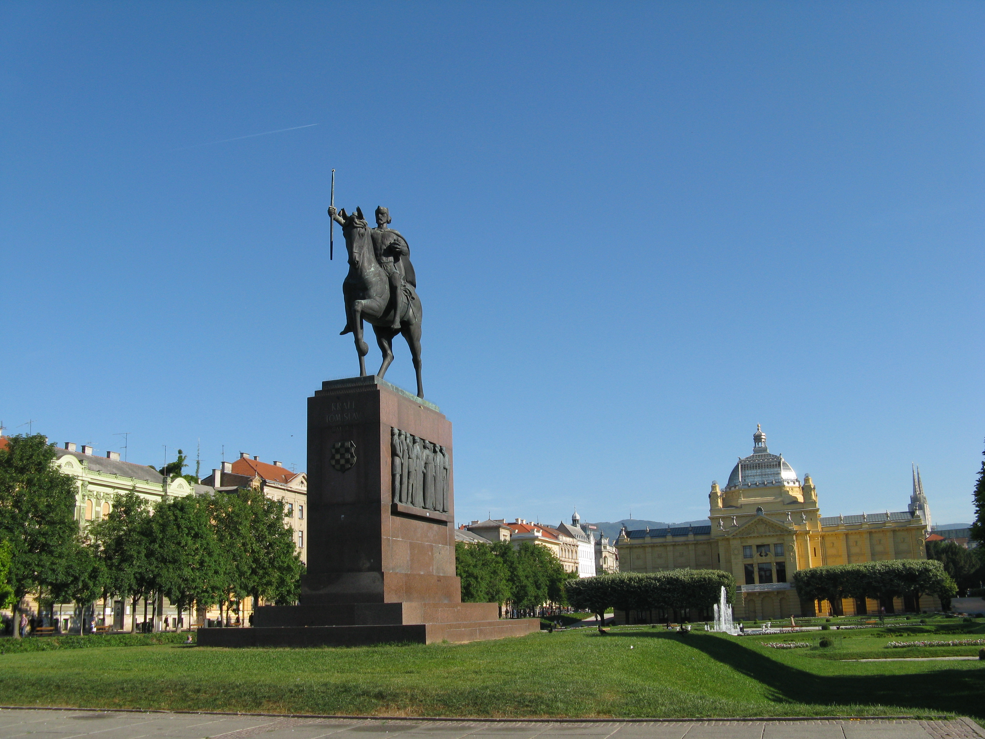 Monument of the Croatian King Tomislav and the art pavilion in a colourful park.