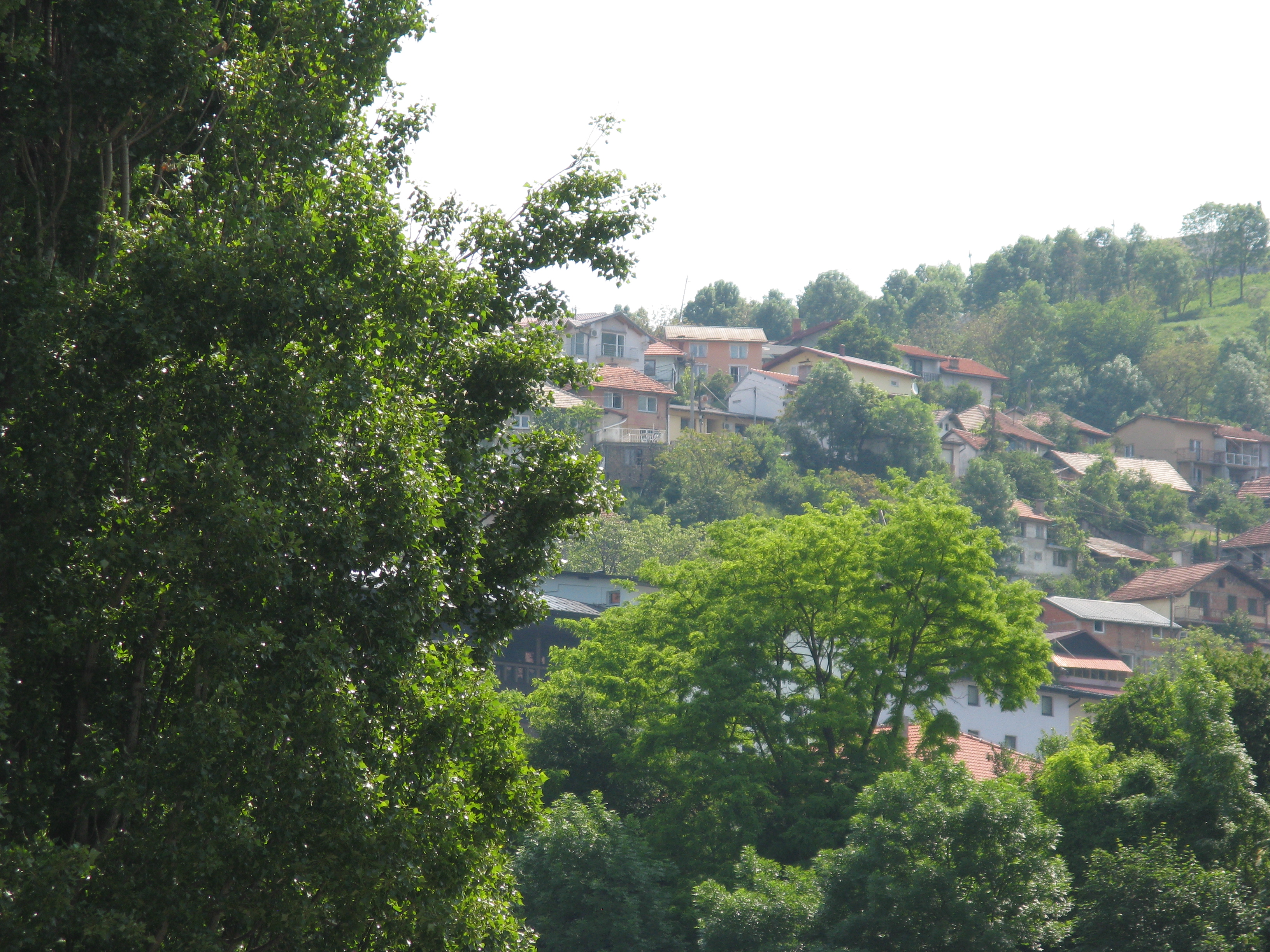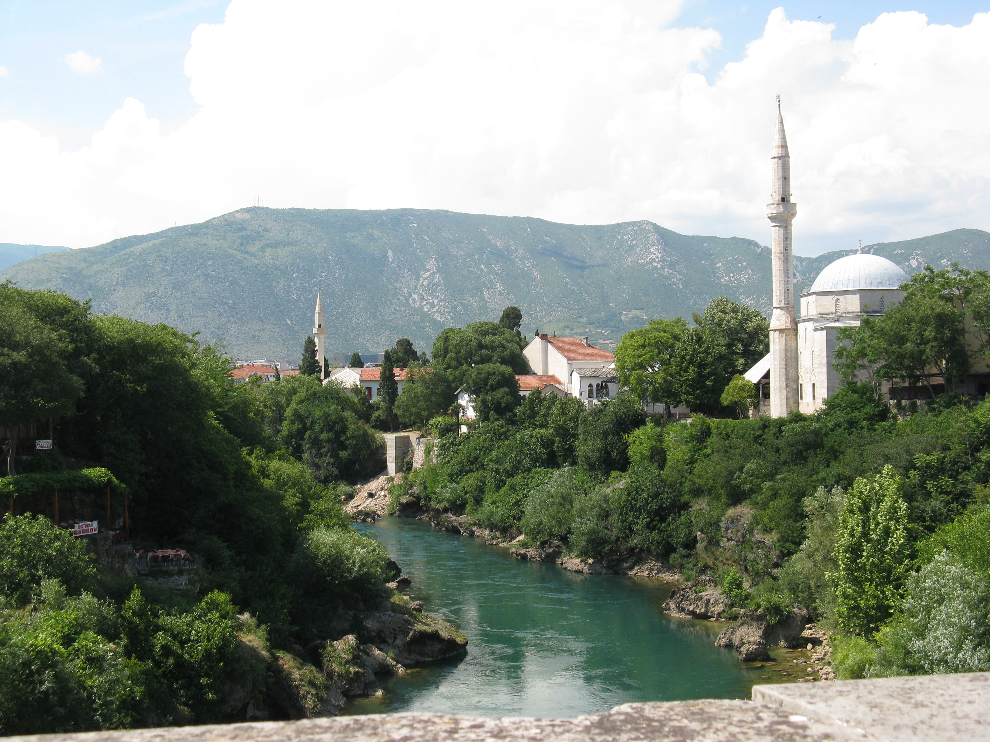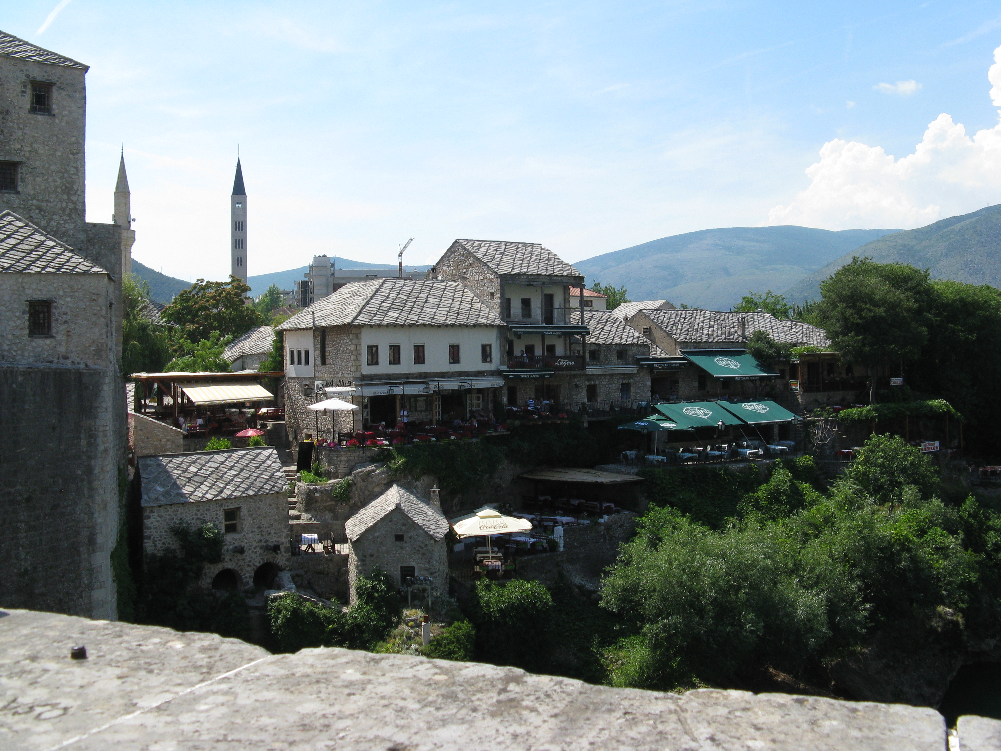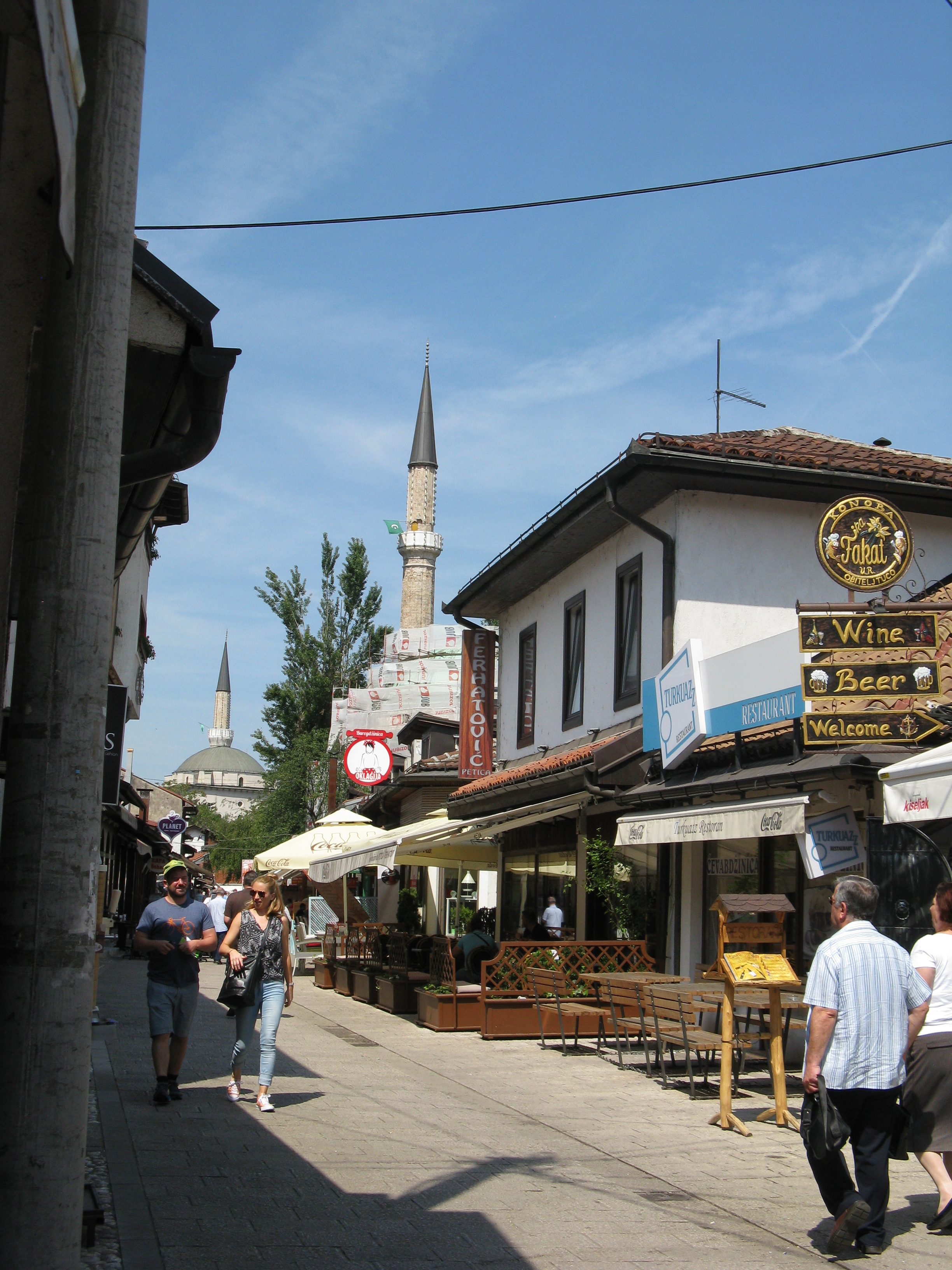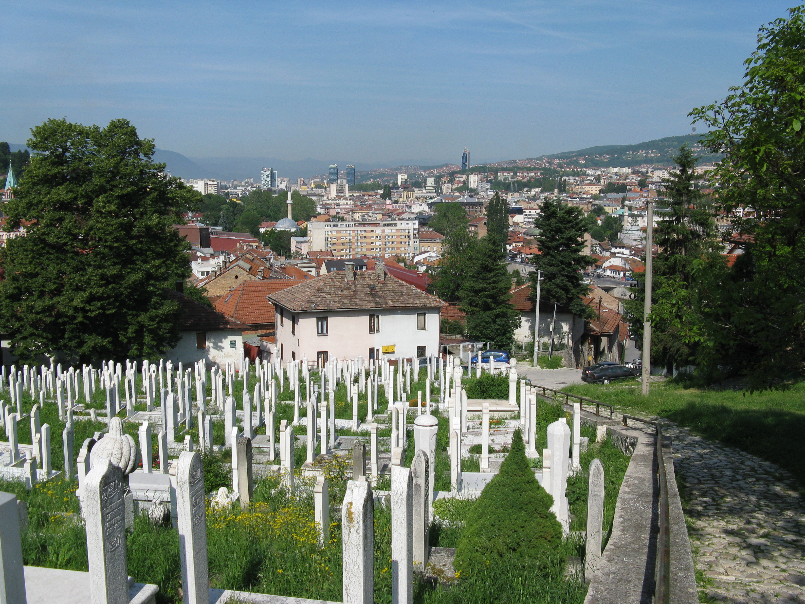 The city’s north and south flanks are steep valley sides fuzzed with red-roofed Bosnian houses and prickled with uncountable minarets rising to green-topped mountain ridges