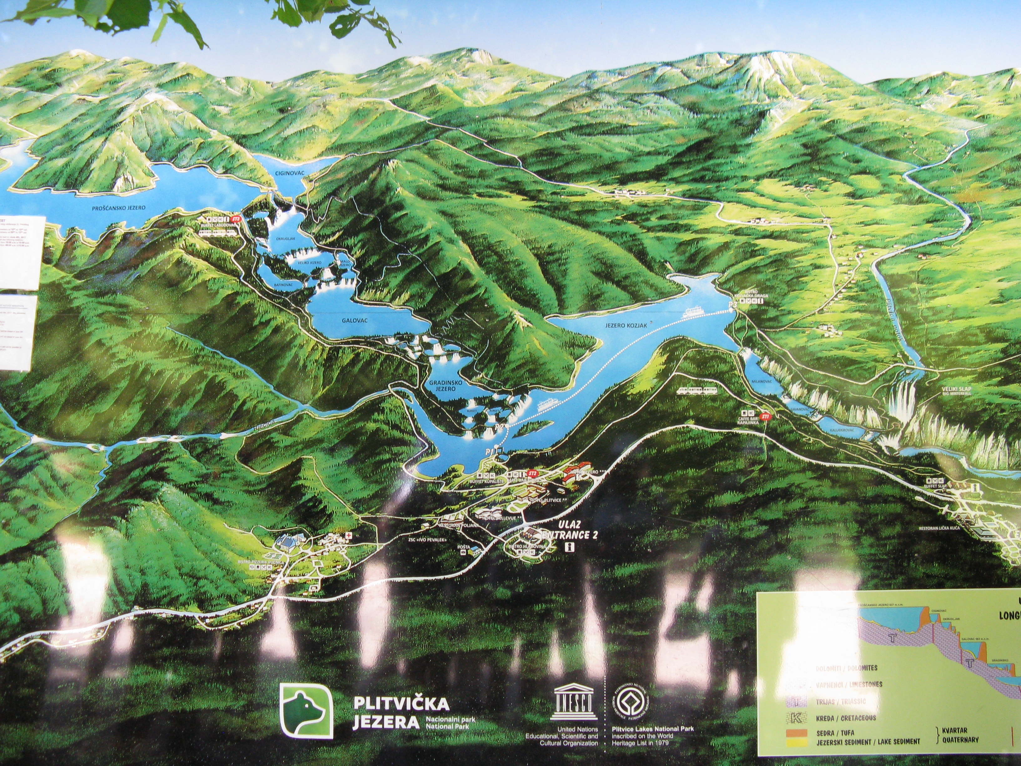 A photograph of the map of Plitvicka National Parks which has a series of 16 lakes which are linked by beautiful waterfalls.