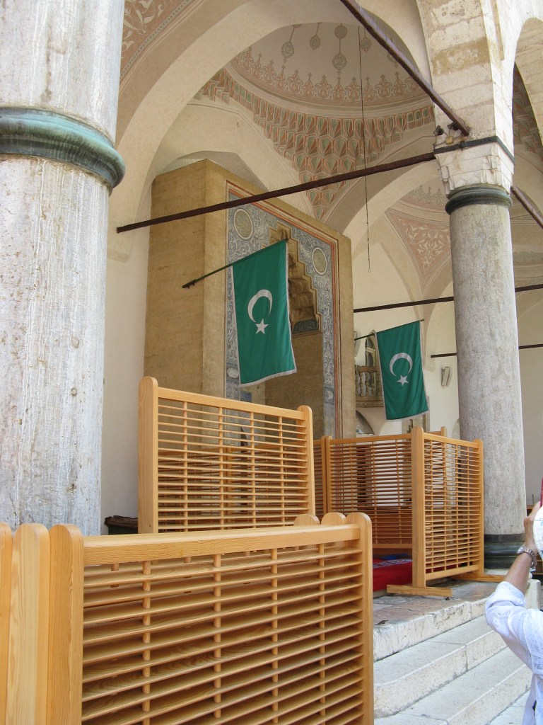 This is a picture of the outside of the the central Mosque , called Gazi Husrev-bey Mosque, is situated within the Bazaar. Built in 16th century, it is the largest historical mosque in Bosnia and Herzegovina and one of the most representative Ottoman structures in the Balkans. Being the central Sarajevan mosque since the days of its construction, today it also serves as the main Congregational mosque of the Islamic community of Bosnia and Herzegovina.