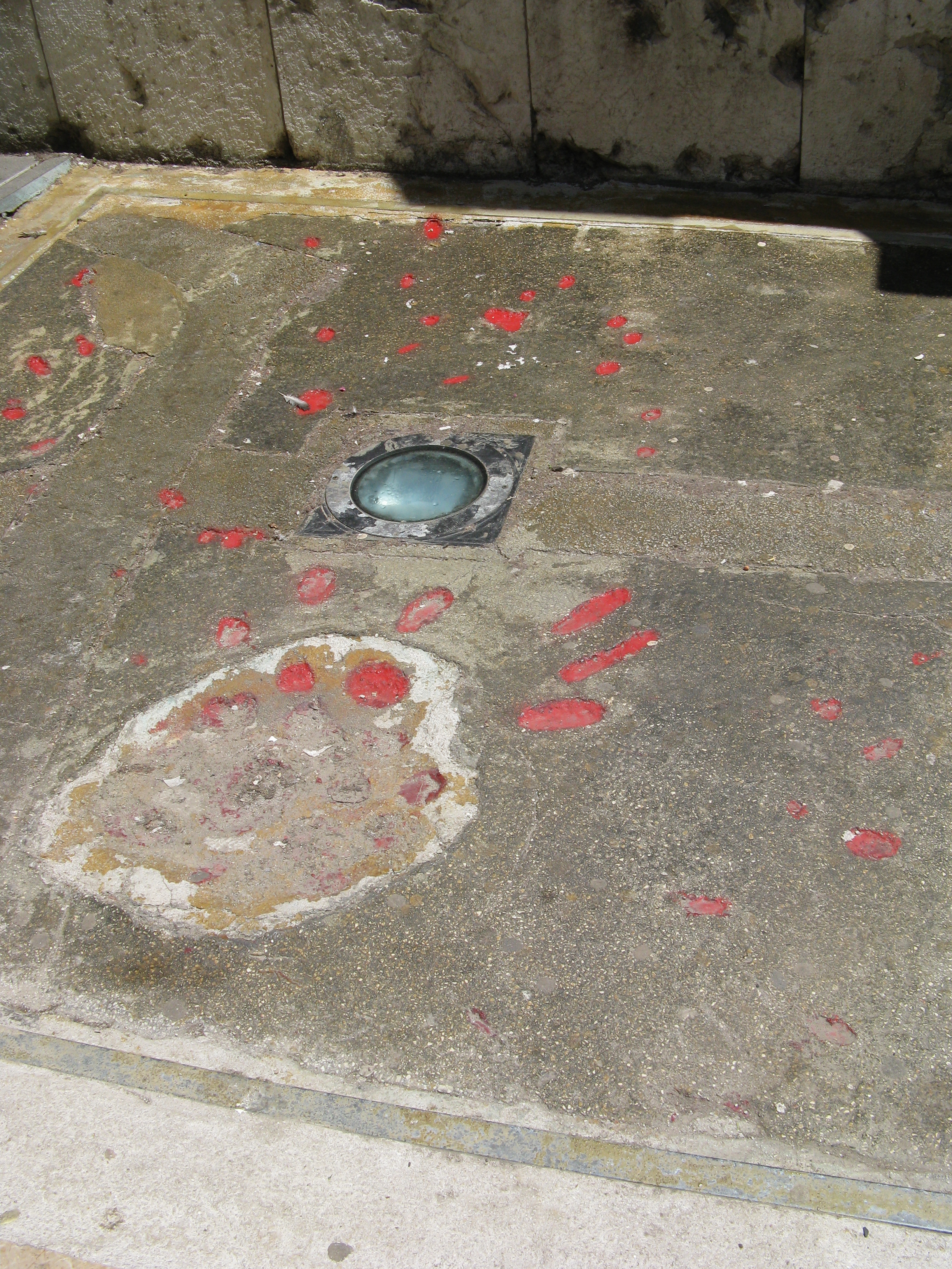 There are many red markings on the floor as a monument to the suffering in Sarajevo of the various conflict that have taken place.
