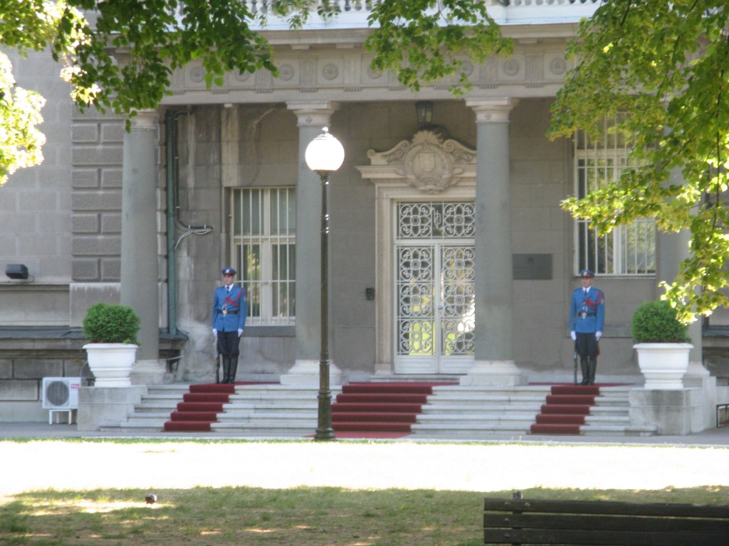 Two guards outside the Novi dvor. This means New Palace and was a royal residence of the Karađorđević dynasty of Serbia and later Kingdom of Yugoslavia. Today it is the seat of the President of Serbia. The palace is located on Andrićev Venac opposite Stari Dvor (Old Palace).