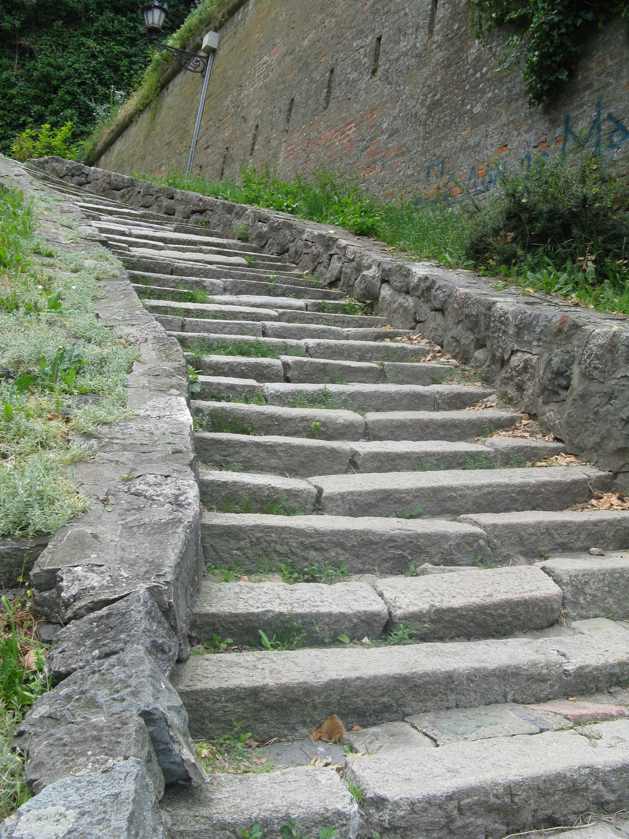 Steep steps up to Petrovaradin Fortress in Novi Sad. It is located on the right bank of the Danube river. The Fortress has many underground tunnels as well as 16 km of uncollapsed underground countermine system.