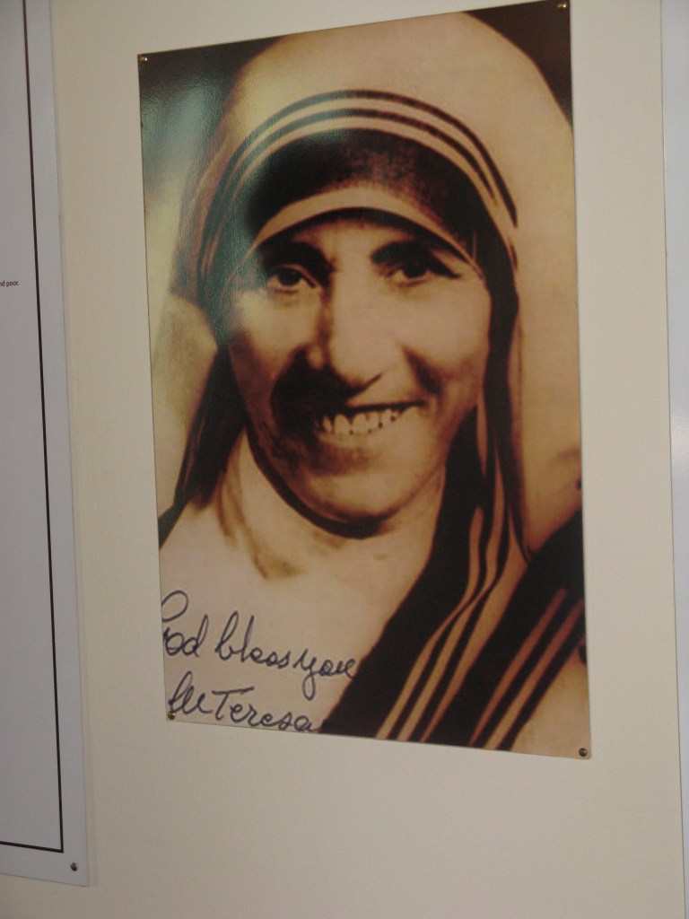 Signed photograph of Mother Teresa which is contained in the Mother Teresa museum.