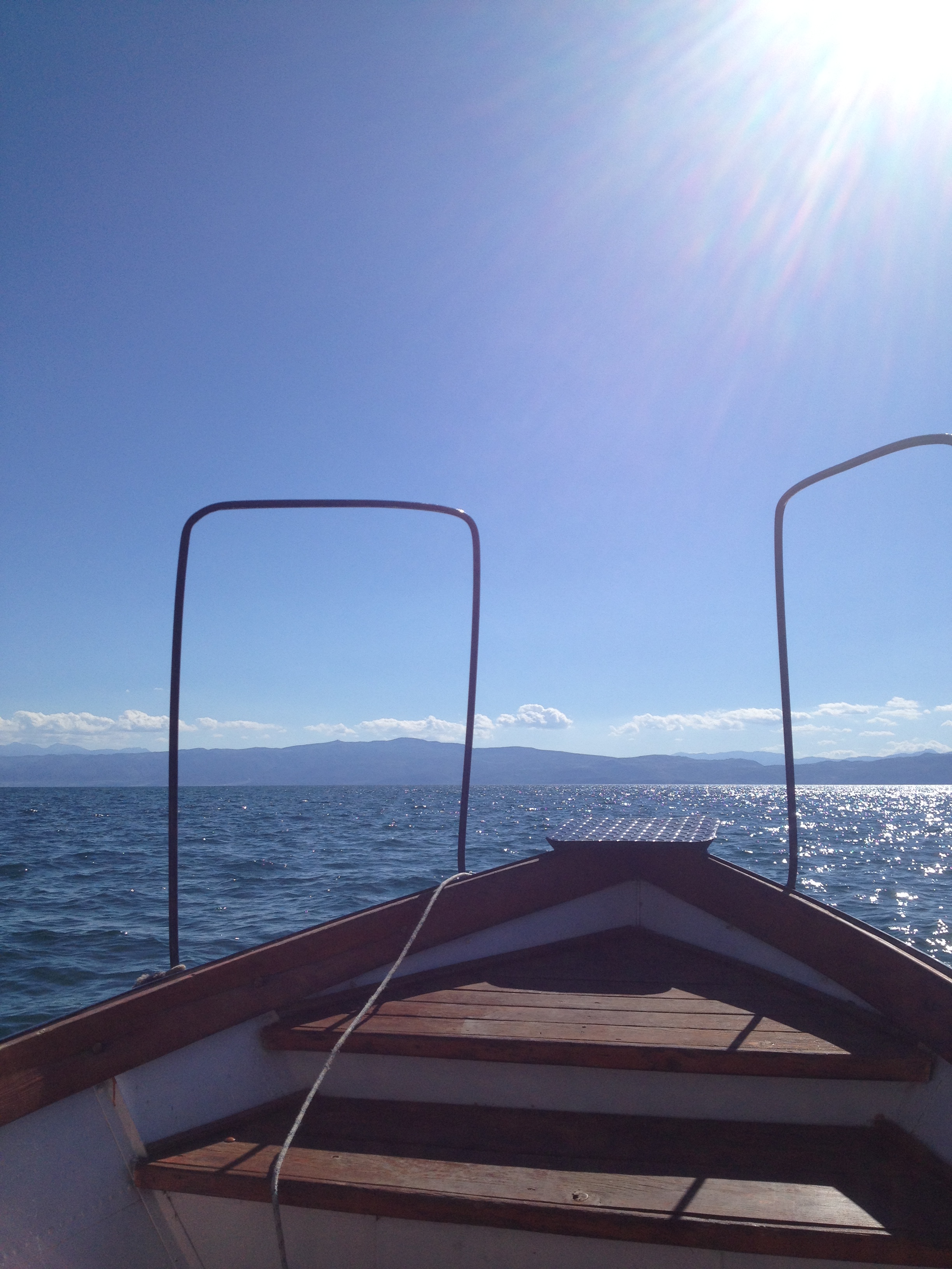 A view from the boat as we head out on a trip on the lake. The coastline in front belongs to Albania.