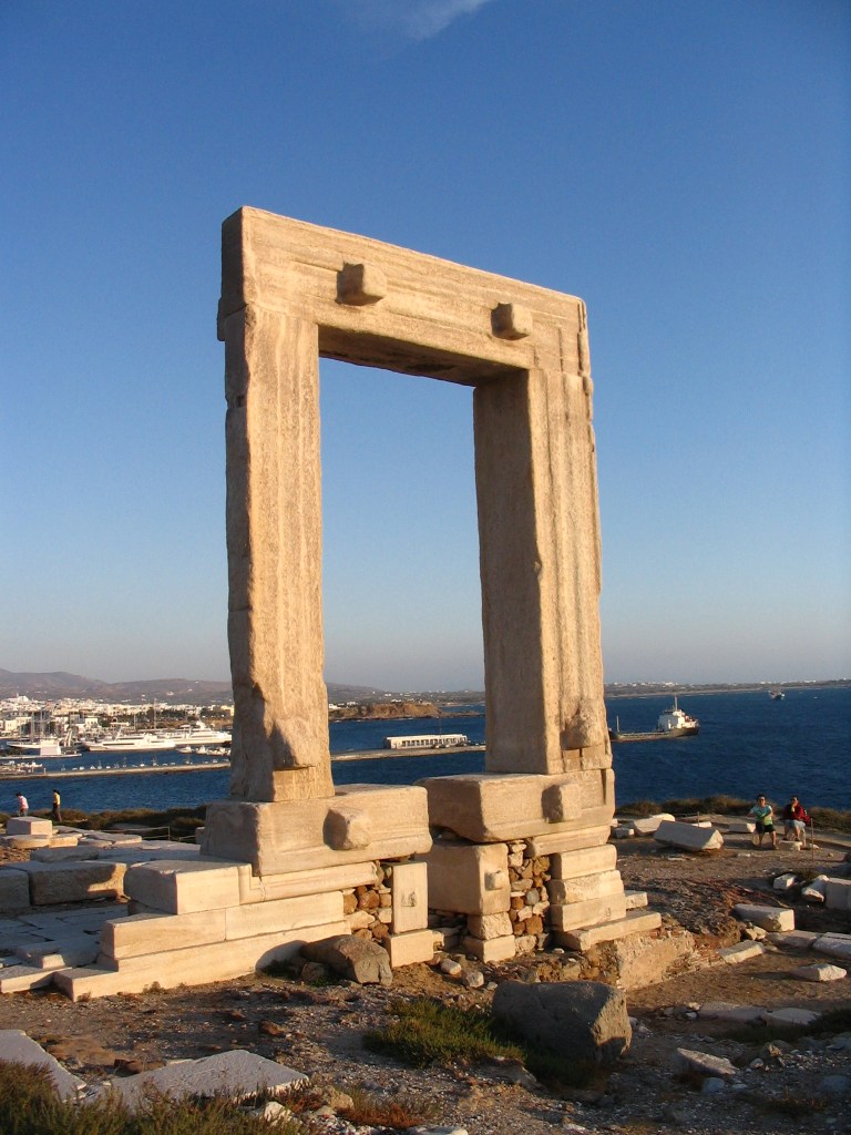 The Portara is an enormous marble frame and is visible for miles, being particularly prominent around the coastline thanks in no small part to its elevated situation. The Portara was built with four blocks of marble, each of a length of over 6 metres and weighing 20 tones. It is the entrance to an unfinished temple that faces directly toward Delos, Apollo’s birthplace. The temple was begun about 530 BC by the tyrant Lygdamis, who said he would make Naxos’s buildings the highest and most glorious in Greece. Only the walls were mostly completed when he was overthrown in 506 BC and the temple was never finished. Evidence from pottery indicates the temple’s cult was abandoned by the 5th century BC.