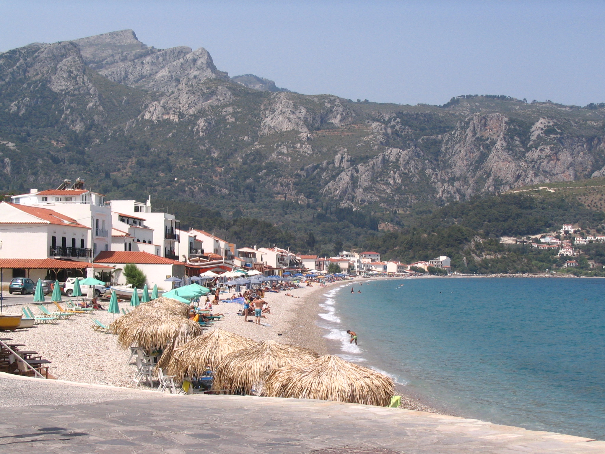 The beach is not golden sand like other beach’s on Greek islands, thinking of Golden Beach on Thassos, but small pebbles/shale.