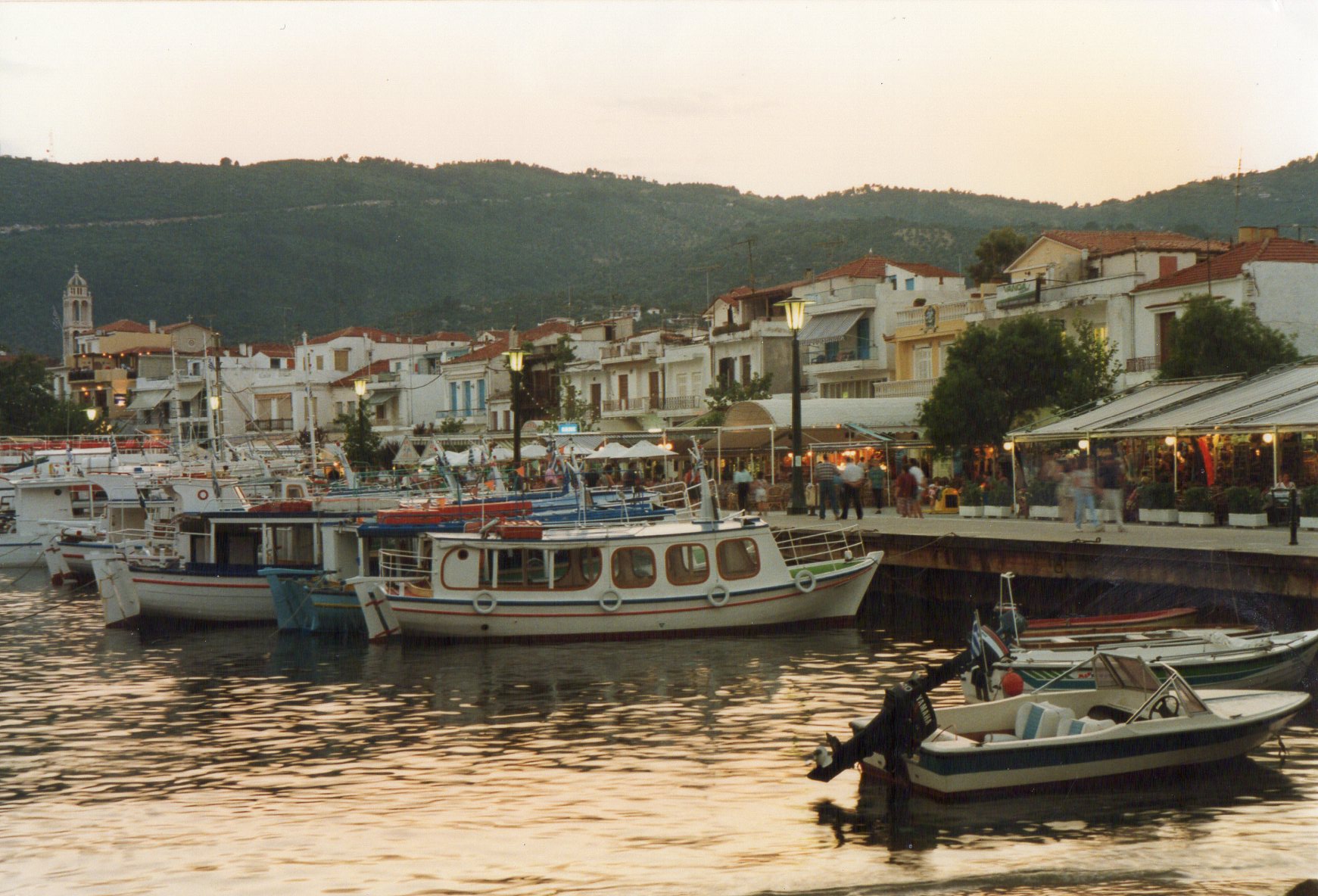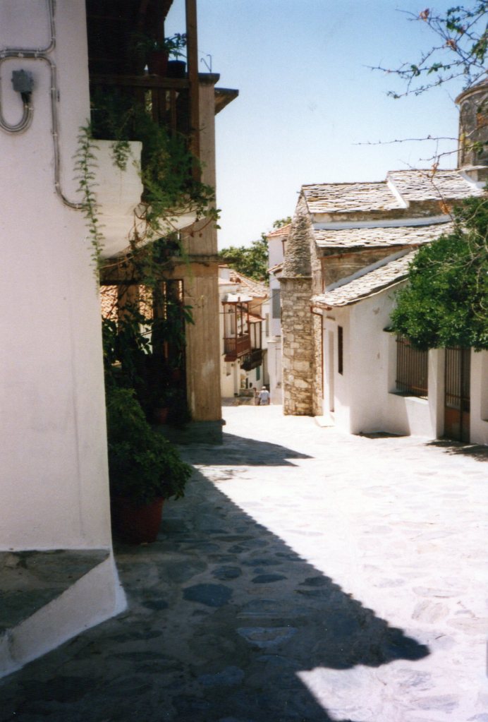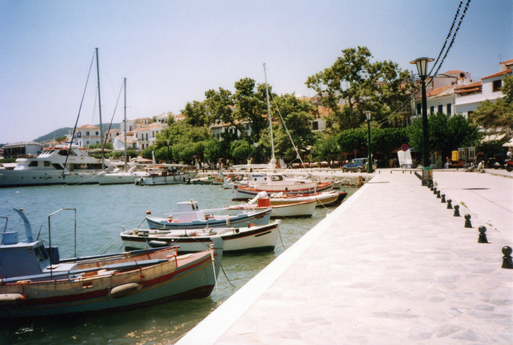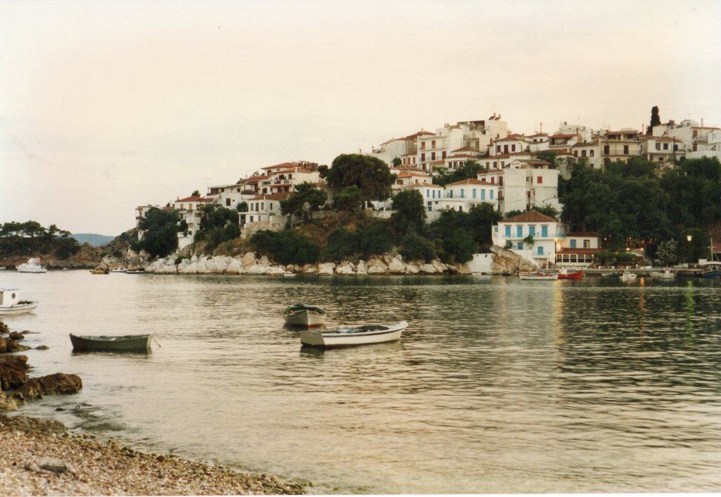 We stayed at the Aegeon Studios in Skopelos Town in June 2003. It is one of the white building on the side of the hill. Lovely walk down, not so much fun on the walk back up.