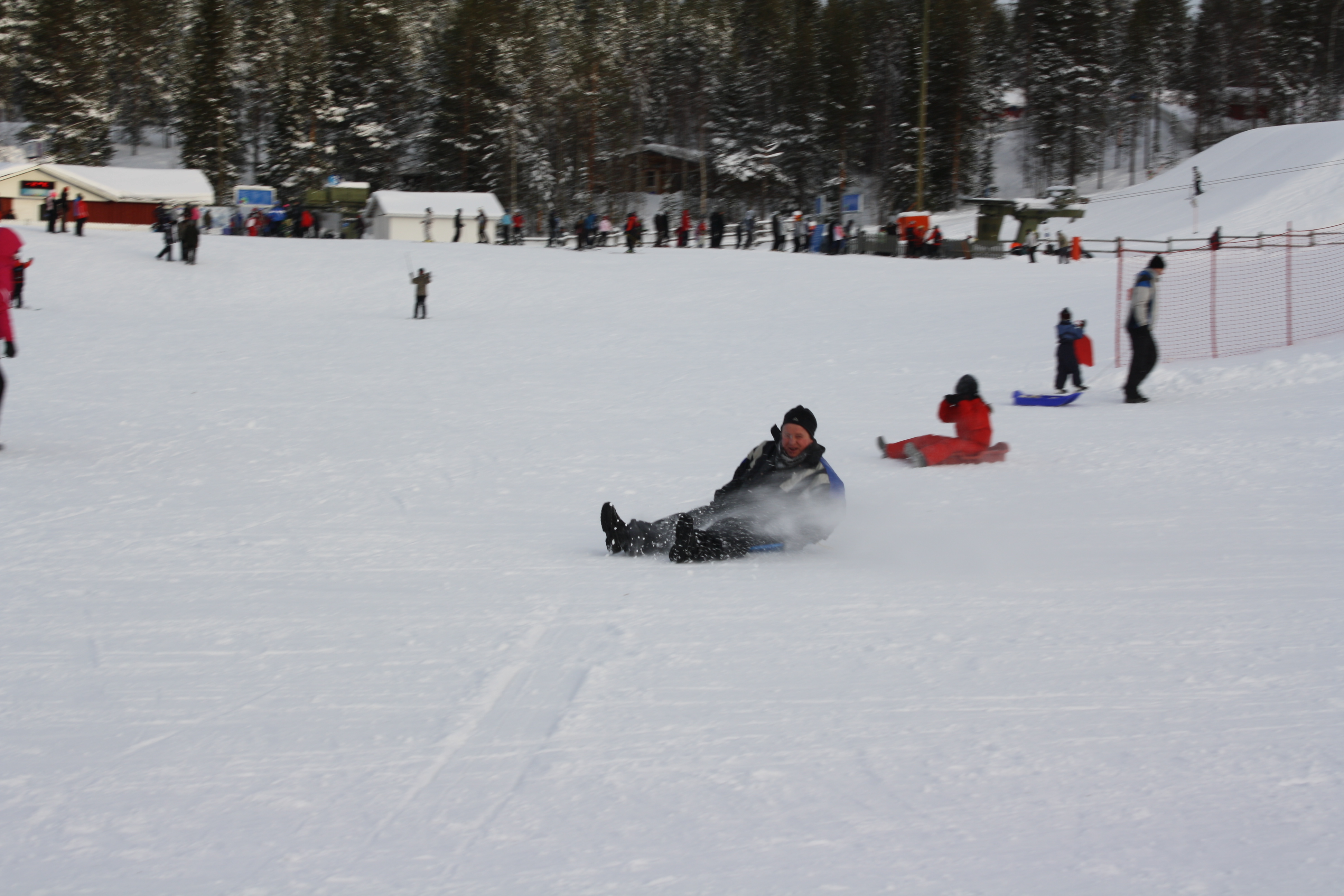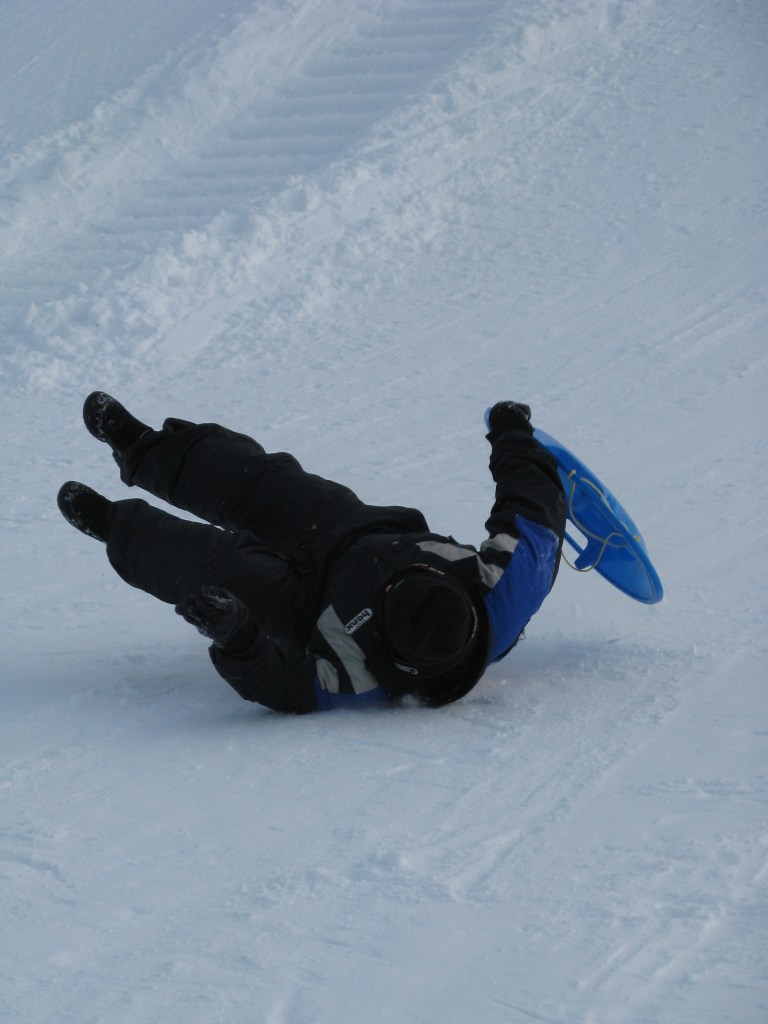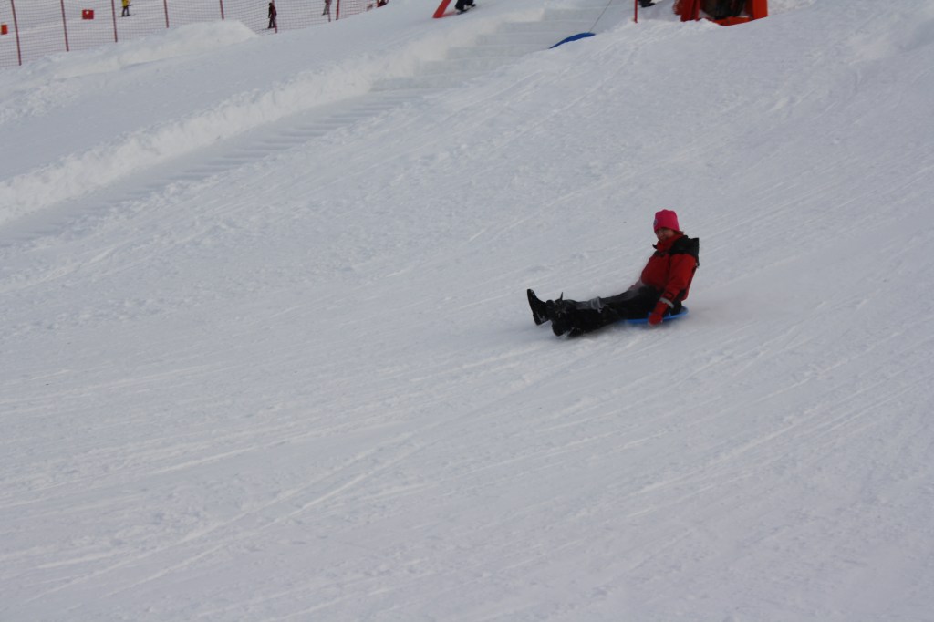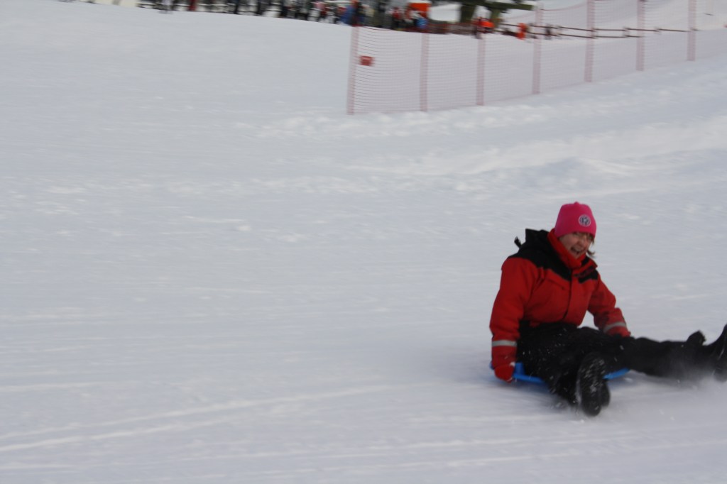 We don’t ski so the next best thing is to regress back to childhood and go sledging.