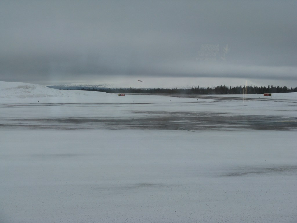 This is not a frozen lake it is in fact the airport runway we were expecting the runway to have been cleared but no, the planes taxi off on snow.