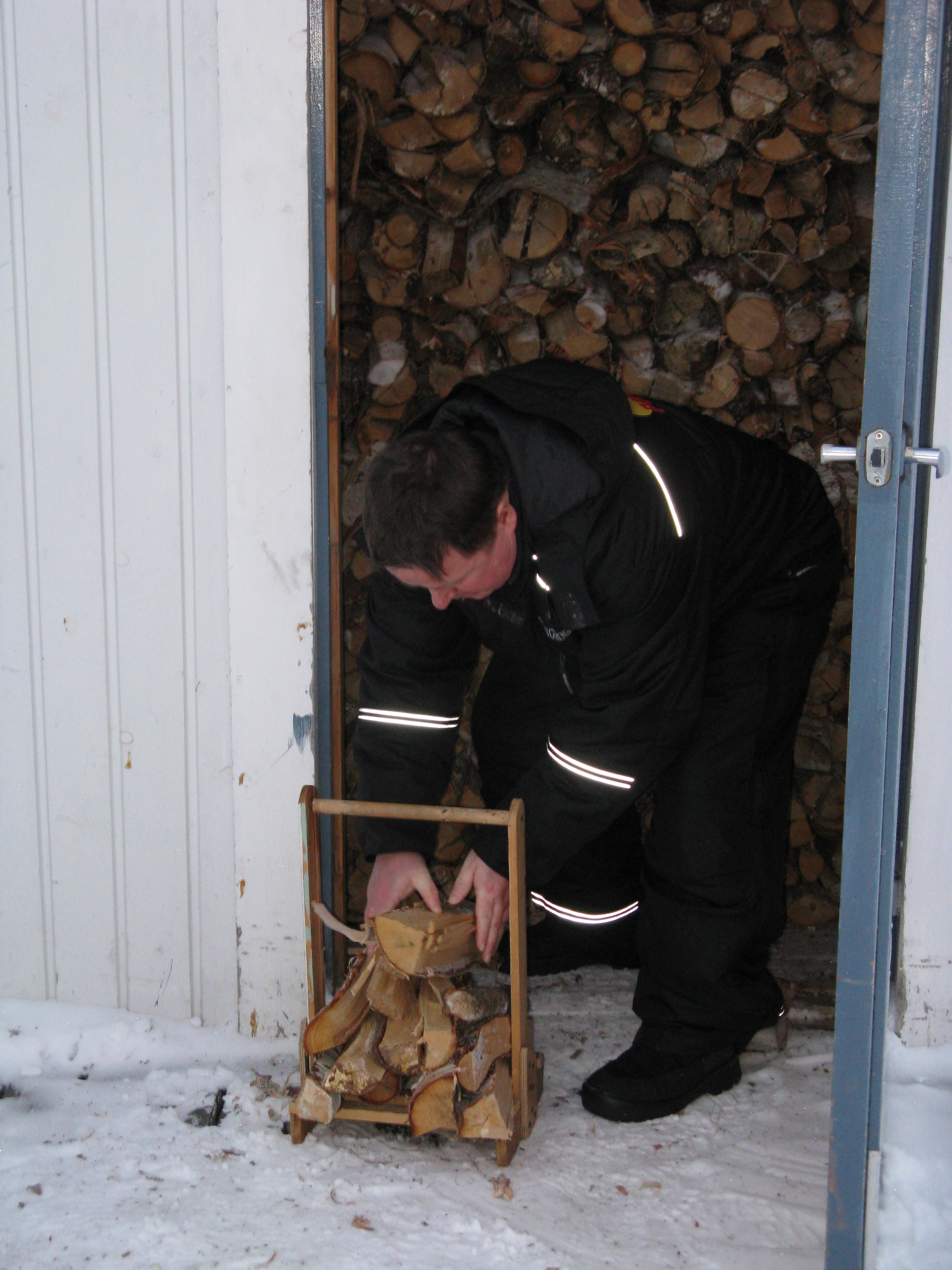 Collecting wood for the fire from the wood shed, awesome.