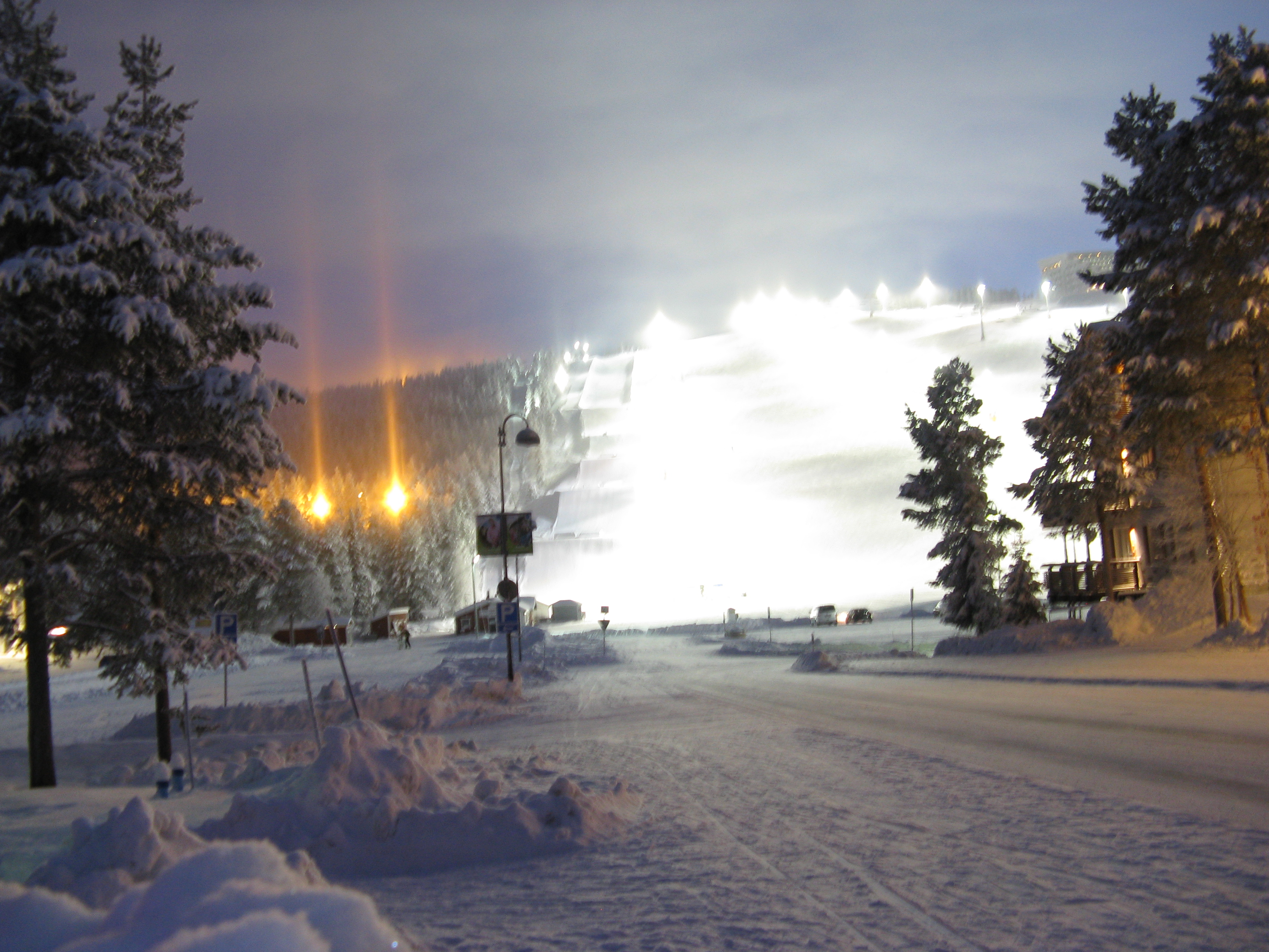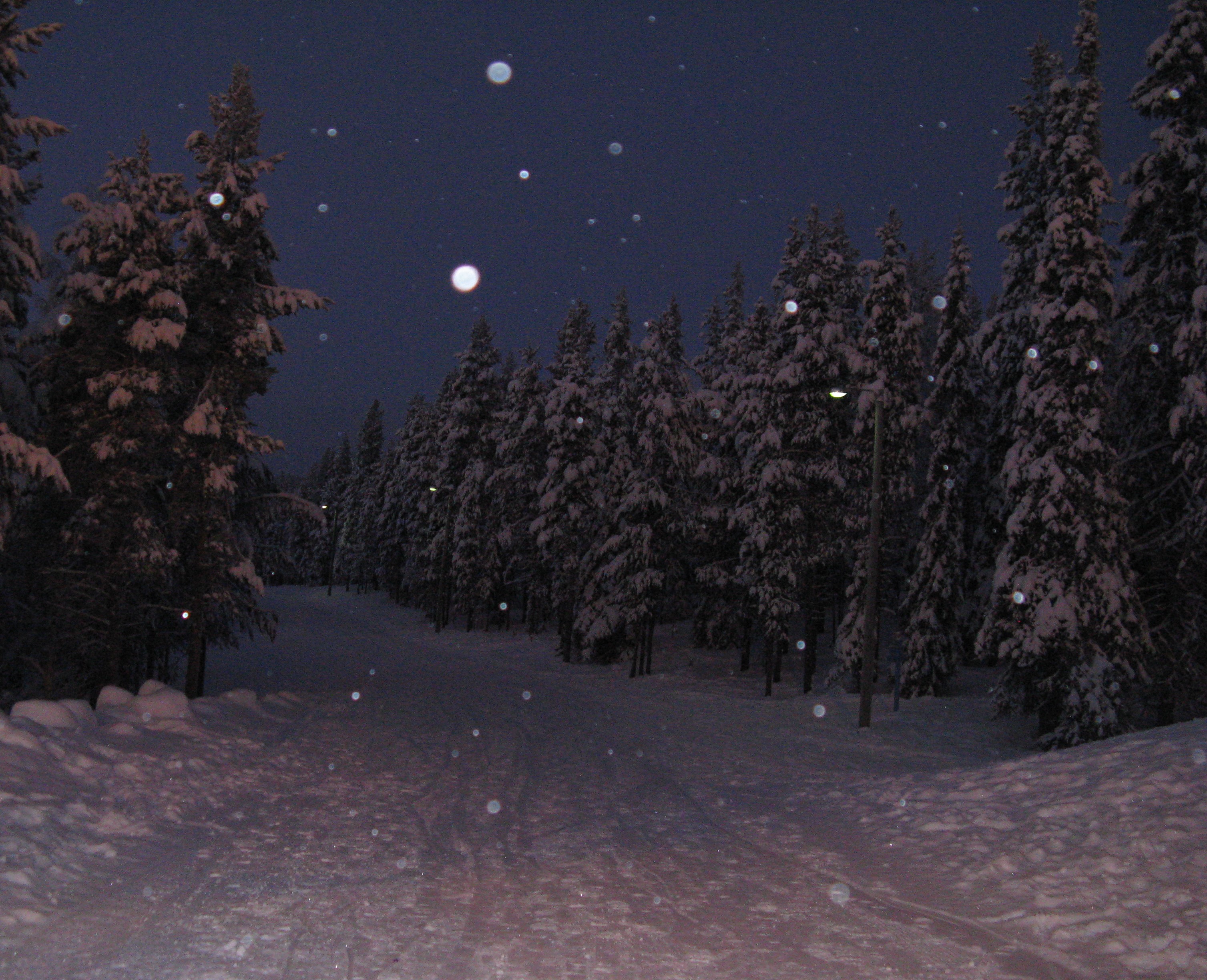 Just outside the village at night with the moon behind us and it starting to snow.