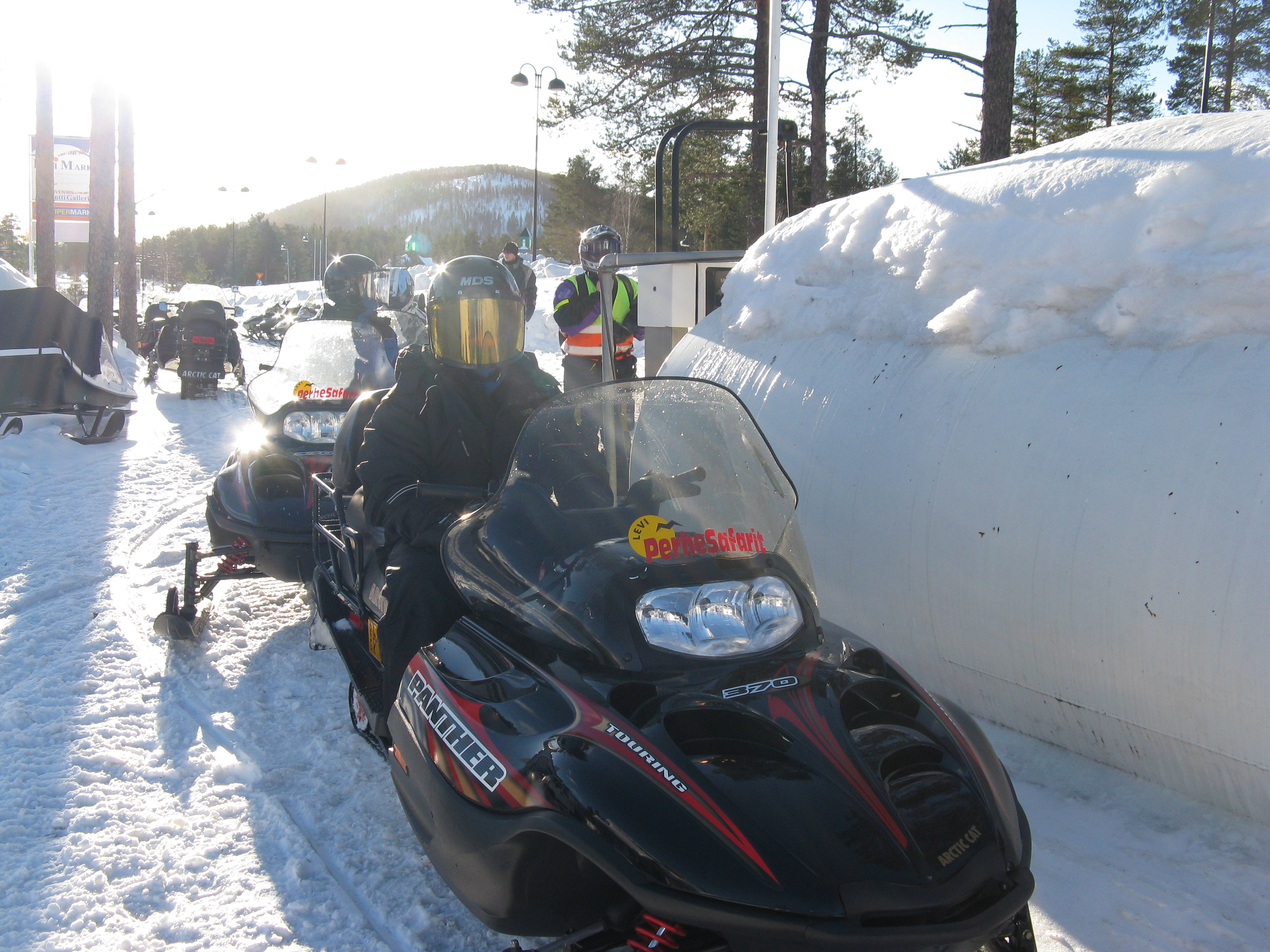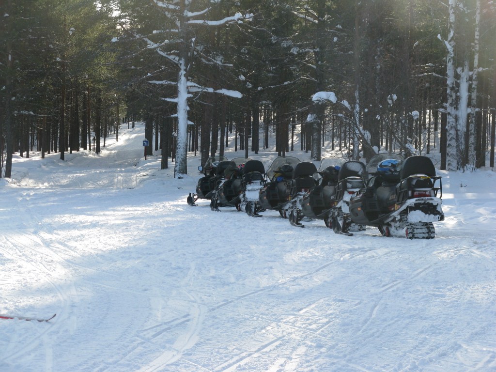 Snowmobiles ready and waiting.