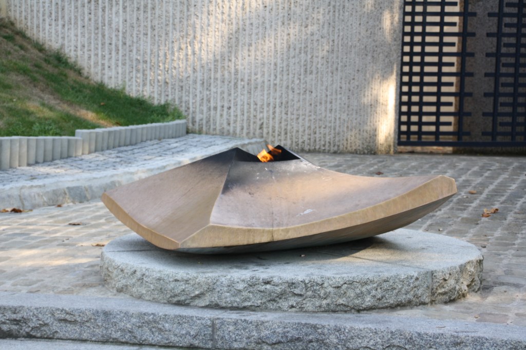 The paved inner courtyard symbolizes prisons, concentration camps and barracks. An ordinary, unchiselled stone represents the war victims. An eternal flame burns in front of this historic monument.