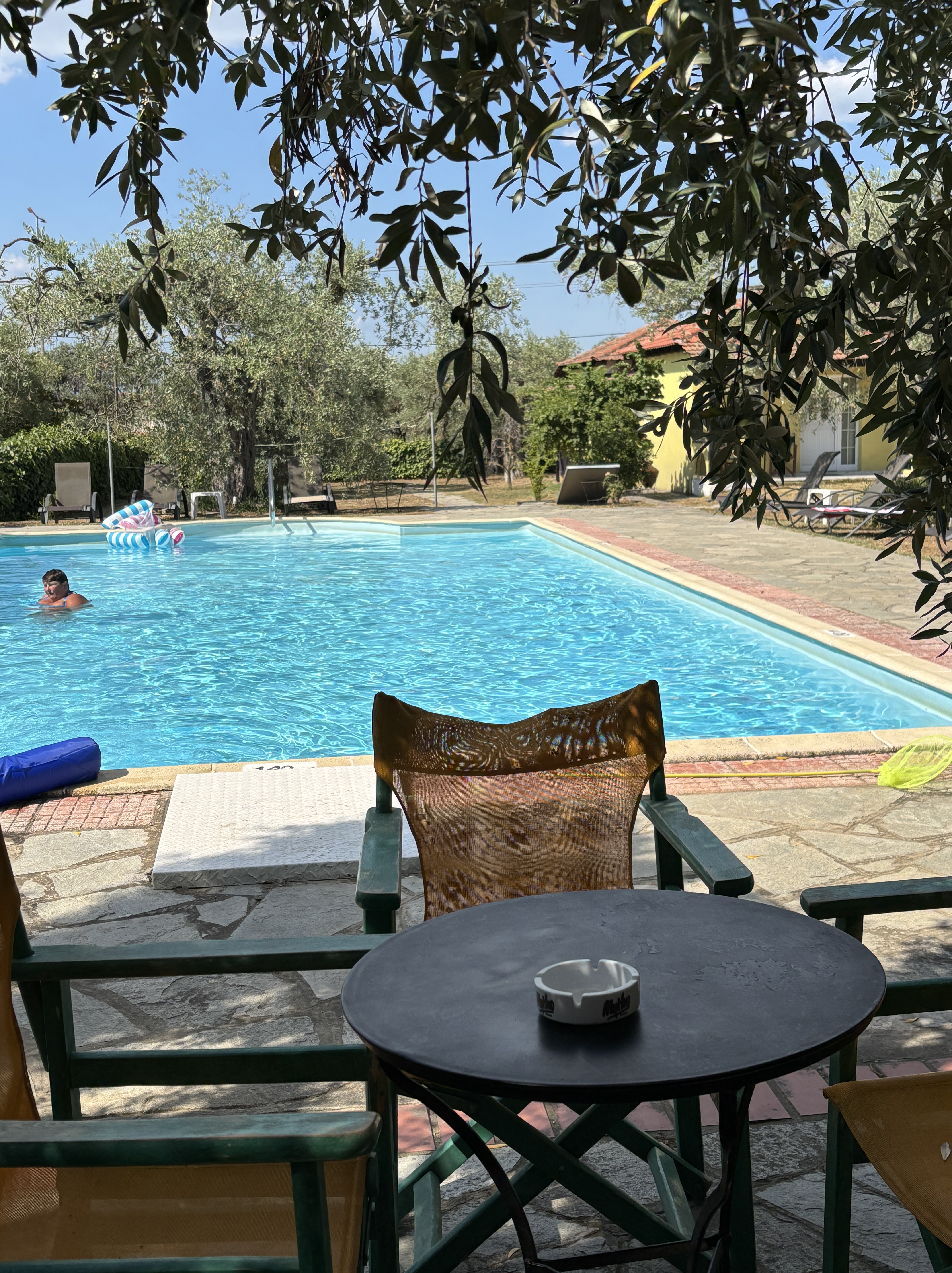 The swimming pool is set amongst the trees which gives shade in the head of the sun but also makes everything tranquil. The picture is taken from the pool bar which is away from the studios and so it’s quiet. There is nothing like sitting by the pool bar with a glass of Ouzo listening to Vassilis tales or strumming his guitar.