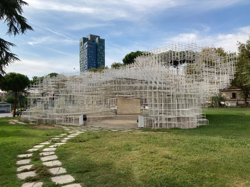 This was originally created for the serpentine pavilion in London in 2013 and resembles a soft cloud, even though it is made of white steel rods. In 2013 it was moved to the green gardens in front of the National Gallery of Arts in Tirana.