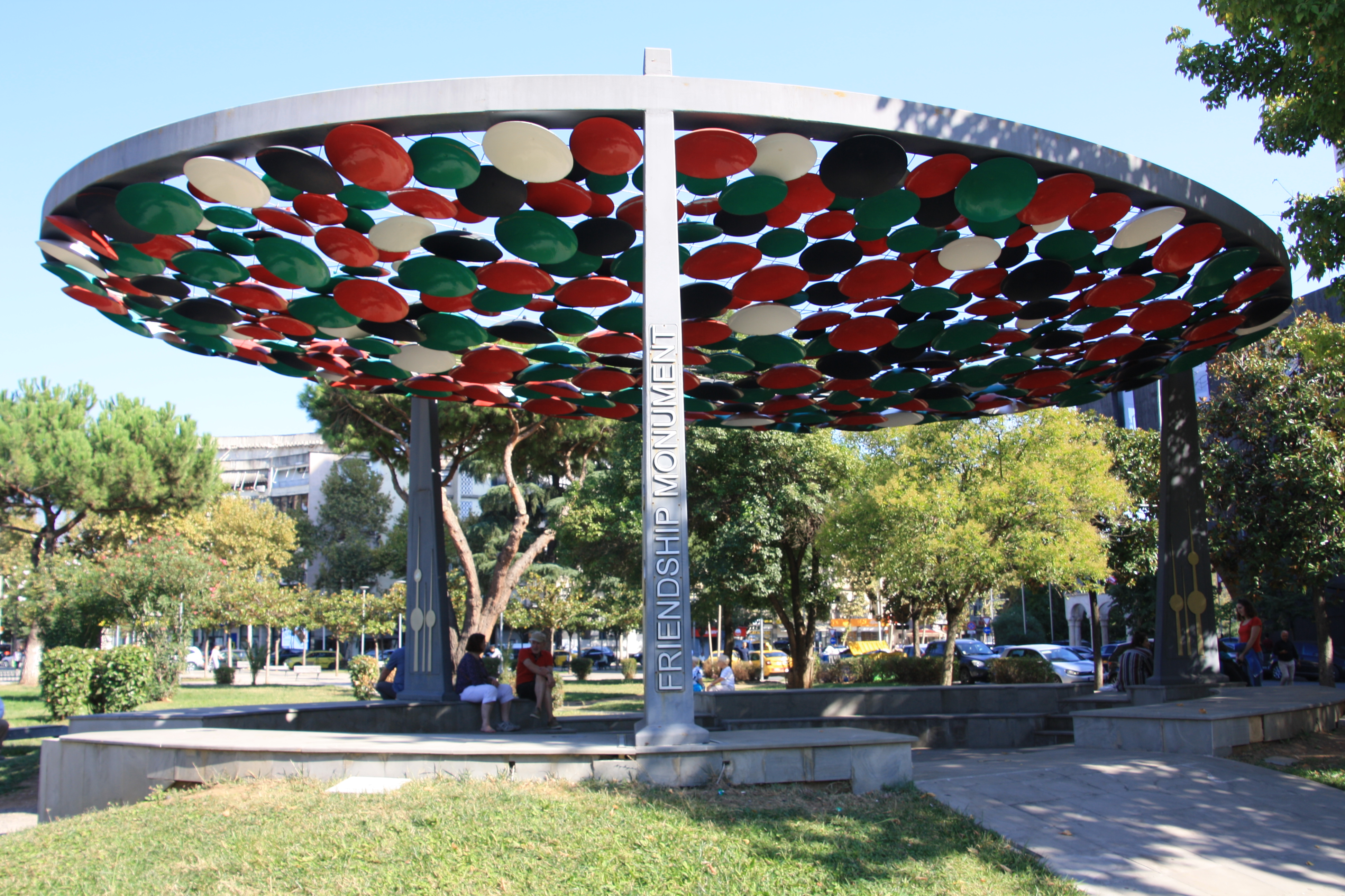 The monument was built to commemorate the friendship and cooperation between Albania and Kuwait. The circles are the same as the colours that make up Kuwaiti flag.