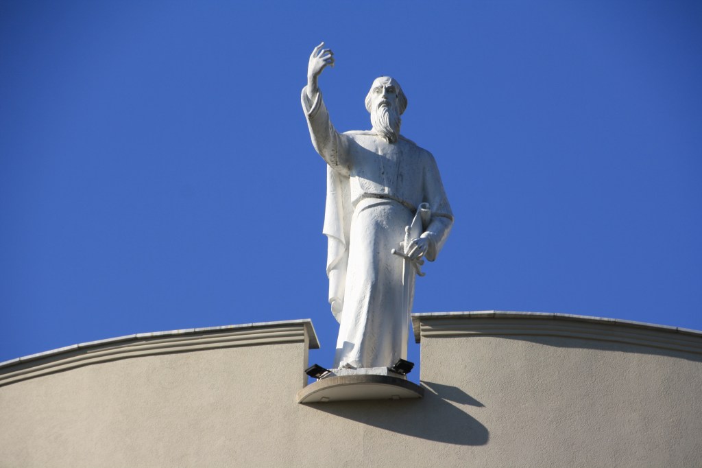 St Paul’s Cathedral belongs to the Roman Catholic Archdiocese of Tiranë-Durrës. The stained glass window to the left of the front door features Pope John Paul II and Mother Teresa, with a further statue of Mother Teresa at the entrance of the cathedral.