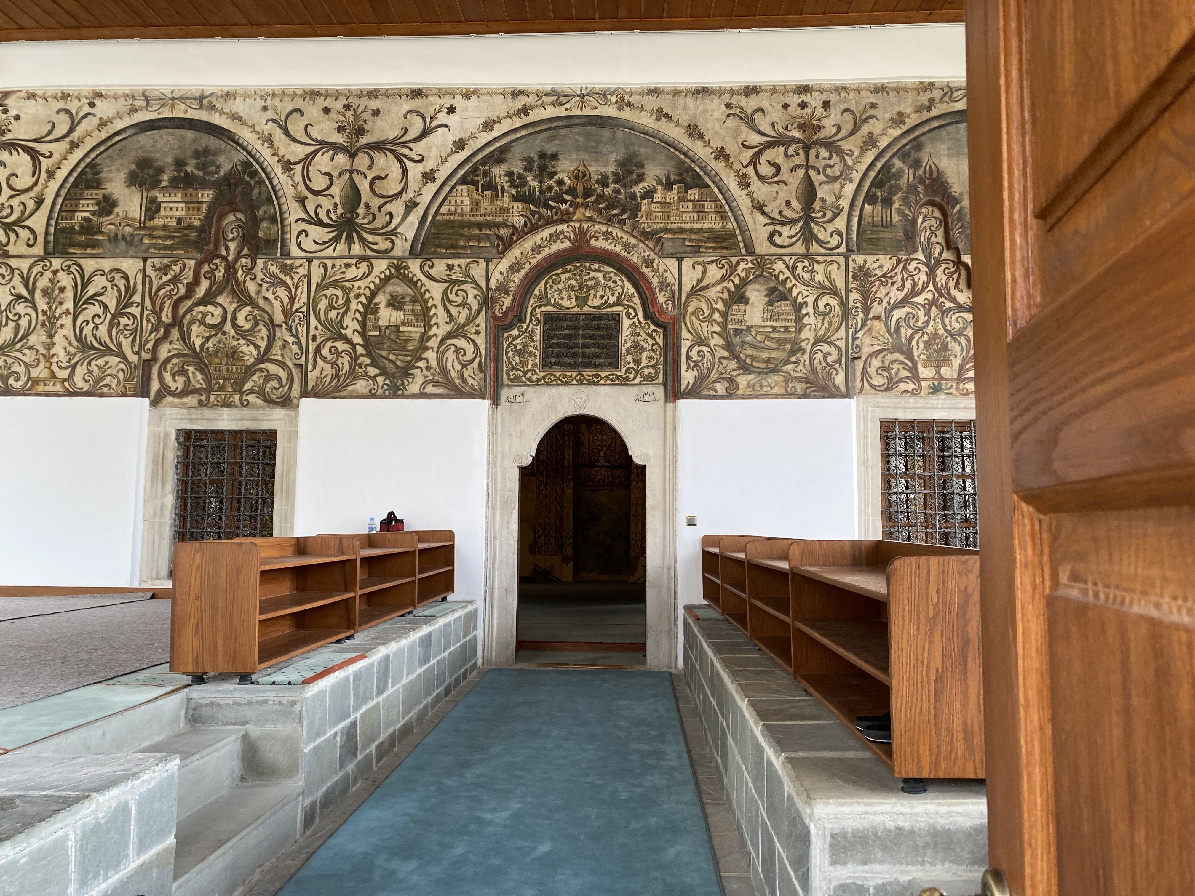 On the outside and in the portico there are colourful frescoes outside which depict trees, waterfalls and bridges, motifs rarely seen in Islamic art.
