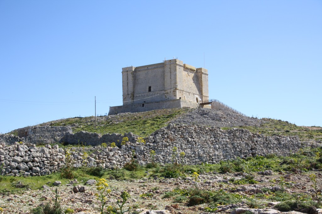 Saint Mary’s Tower, also known as the Comino Tower, is a large bastioned watchtower on Comino in Malta. It was built in 1618, the fifth of six Wignacourt towers. The tower was used by the Armed Forces of Malta until 2002, and it is now in the hands of Din l-Art Ħelwa. Din l-Art Ħelwa is a non-governmental and non-profit, voluntary organisation founded in 1968, by Maltese Judge Maurice Caruana Carron, to safeguard Malta’s cultural heritage and natural environment.